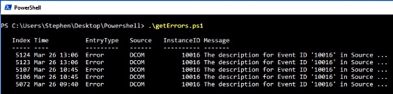 Save the file extension .ps1 for example getErrors.ps1. To run the script, navigate to the folder you saved it in and enter the script name. Don't forget to prefix the script name with .\ so PowerShell looks in the current directory for the file.
